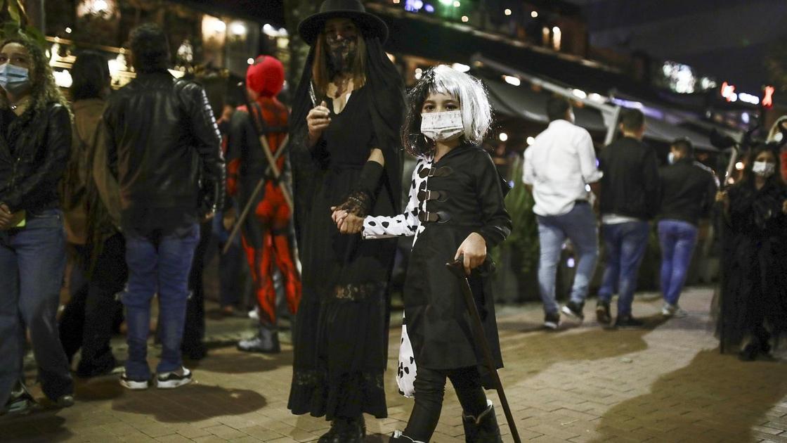 BOGOTA - COLOMBIA, OCTOBER 31: People take part in the annual Halloween parade despite the coronavirus (COVID-19) pandemic in Bogota, Colombia on October 31, 2021. People dress and use make-up to make themselves look like different characters from horror movies. More than 1.000 revelers attended this event. (Photo by Juancho Torres/Anadolu Agency via Getty Images)