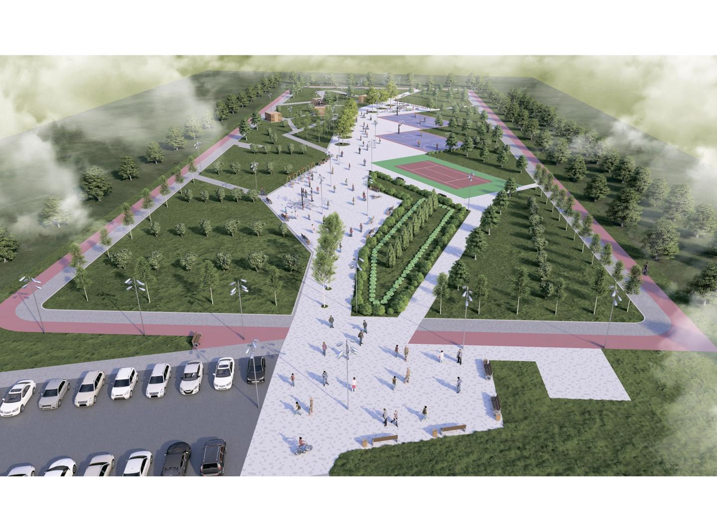 Қазір 2,5 гектарды алып жатқан саябақта көгалдандыру жұмыстары жүргізілуде. 900 шаршы метрге асфальт жабындылары төселіп, 8 мыңнан аса шаршы метрге түрлі өрнектастар орнатылған.