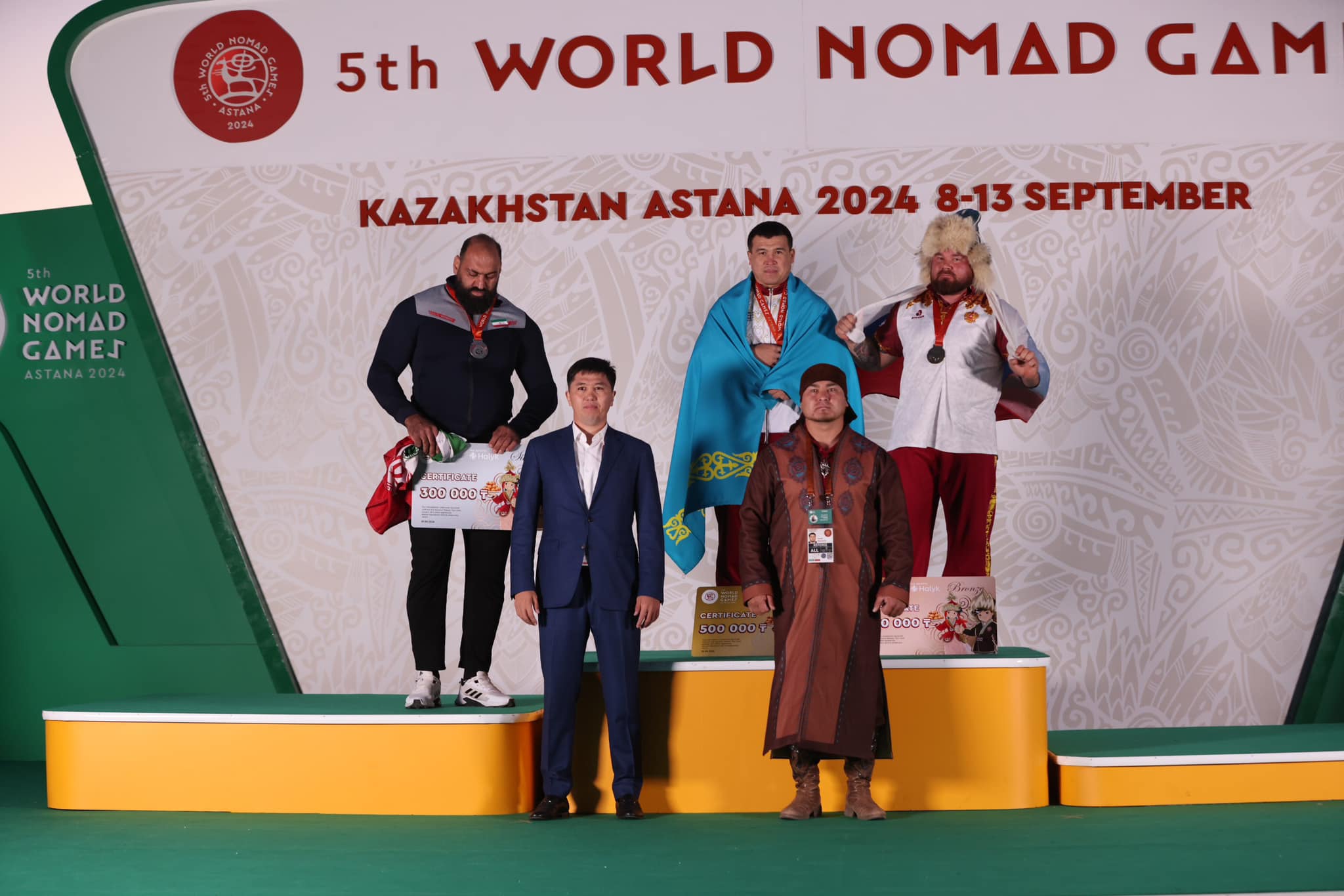 Түркістан облысы, Арыс қаласының қайратты азаматы Азамат Мақұлбеков бөрене көтеру сайысында 130 келі бөренені 38 рет көтеріп өз рекордын жаңартты. Сондай-ақ ауыр найзаны нысанаға лақтыру сайысында да ең үздік нәтижені көрсетті. Ақтық сында, Азамат Мақұлбеков 100 келі салмақтағы серкені 7 рет көтерді. Жарысқа қатысушылар ішінде салмағы ең аз болса да, жерлесіміз жарты тонналық арбаны құмның үстінде 12,9 метрге сүйреді. Қортындысында, Қазақстандық алып барлық кезеңде көш бастап, жеңімпаз атанды.